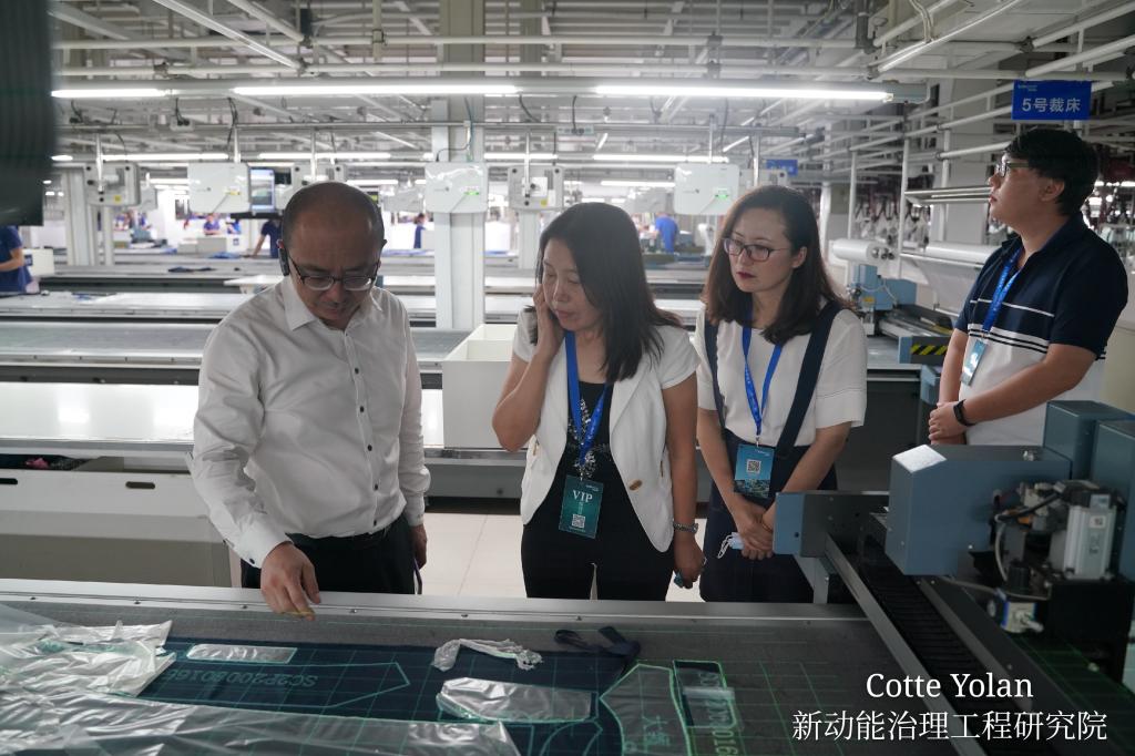 在李克鹏的陪同下,郑海涛一行乘车依次前往酷特智慧工厂—工业定制式生产车间、熔喷布生产车间和口罩生产车间进行参观。现场观摩了从数据采集、数字化裁剪、智能仓储到智能物流一条龙式完整的智能制造工业流程,庞大的机械传送带将每一位客户的私人定制产品自动传递给相应工种的技术人员,配合智能终端,一对一地完成技术加工制作。整个车间没有管理人员,扁平化的管理模式充分赋能每一位员工,大大提高了管理效率和工作效率。