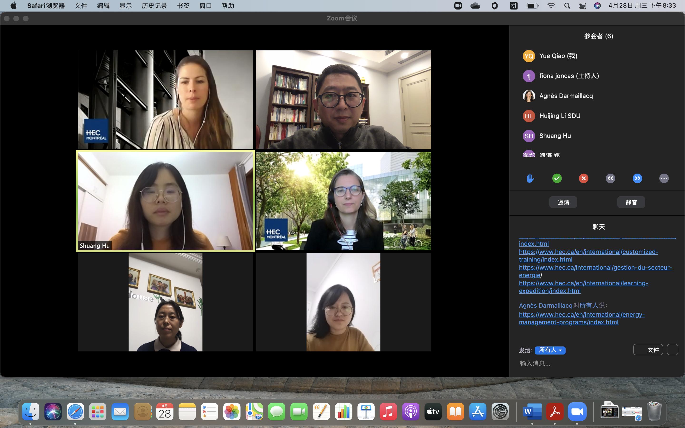 Montreal)召开视频会议,探讨合作事宜。HEC负责国际事务的项目主管Agnes Darmaillacq和Fiona Joncas,国际事务部项目主管李会静,学院副院长乔岳、办公室和EDP中心主任郑海涛、人事外事秘书胡爽参加会议。