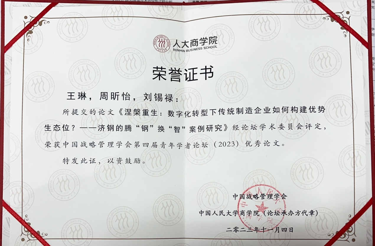 硕士研究生周昕怡就团队论文《涅槃重生:数字化转型下传统制造企业如何构建优势生态位?——济钢的腾“钢”换“智”案例研究》进行了汇报。该论文基于济钢集团有限公司的腾“钢”换“智”转型升级过程,采用纵向单案例研究方法解开传统制造企业数字化转型下构建优势生态位的过程路径和构建机制,并提炼了深层次的创生逻辑。论文既拓展了现有理论和弥补了现有研究的不足,又为数字化转型下传统制造企业获取新竞争优势和实现转型升级提供了一定借鉴和启示。王琳副研究员团队的此篇论文经论坛学术委员会评定,荣获本次论坛优秀论文。