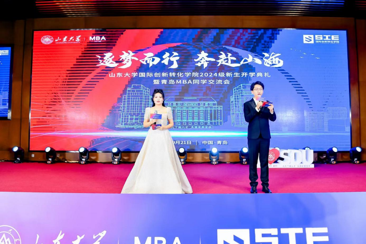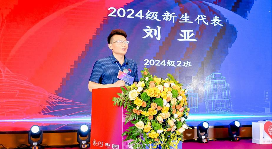 MBA2024级新生代表刘亚发言。他对2024级新生的未来充满信心,作为山大的一份子,2024级新生也会将历届山大人的精神传承发扬。作为此次活动的总导演,他展示了新时代青年的精神风貌与责任担当。作为MBA2024级2班的班长,刘亚深感责任重大。班长是班级活动的牵头人和领导者,期待所有班委成员团结合作,为班级融合、品牌打造贡献出了自己的力量。
