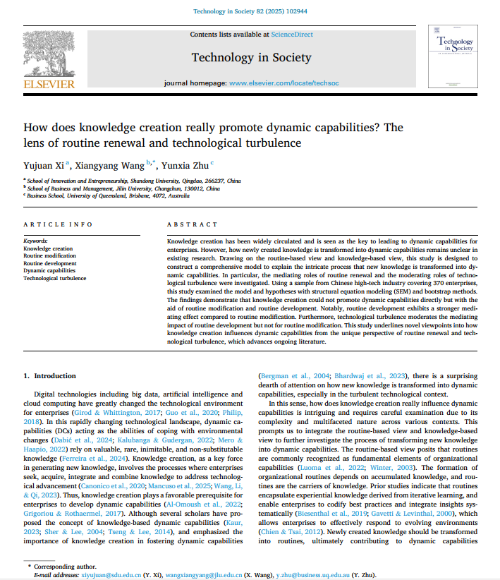 郗玉娟助理研究员与合作者以“How does knowledge creation really promote dynamic capabilities? The lens of routine renewal and technological turbulence”为题的研究论文,在管理学领域期刊《Technology in Society》上发表。该期刊是JCR一区中科院一区Top期刊,最新影响因子为10.1。郗玉娟助理研究员为该论文的第一作者,91成人电影
