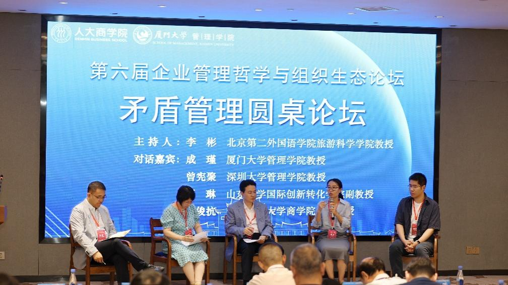 王琳副教授受邀出席“矛盾管理圆桌论坛”,就“AI新科技影响下组织管理中的悖论与矛盾研究”同与会嘉宾进行深入探讨。陈志军教授主持大会主题报告环节,华南理工大学工商管理学院吕源教授、厦门大学信息学院周昌乐教授、北京大学心理与认知科学学院张燕研究员分别进行报告。