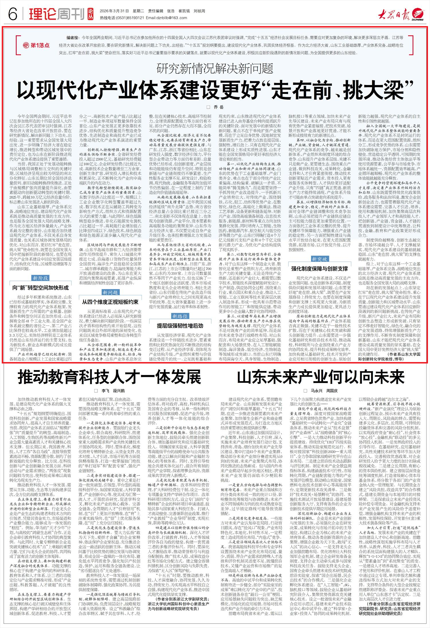 教授乔岳的文章《以现代化产业体系建设更好“走在前、挑大梁”》。习近平总书记在参加十四届全国人大四次会议江苏代表团审议时强调,经济大省要在研究新情况、解决新问题上下功夫、出经验,文章立足这一重要要求,提出山东要以建设现代化产业体系为抓手,更好扛牢“走在前、挑大梁” 使命担当,在服务全国高质量发展大局和优化区域协调发展格局中展现大省作为。