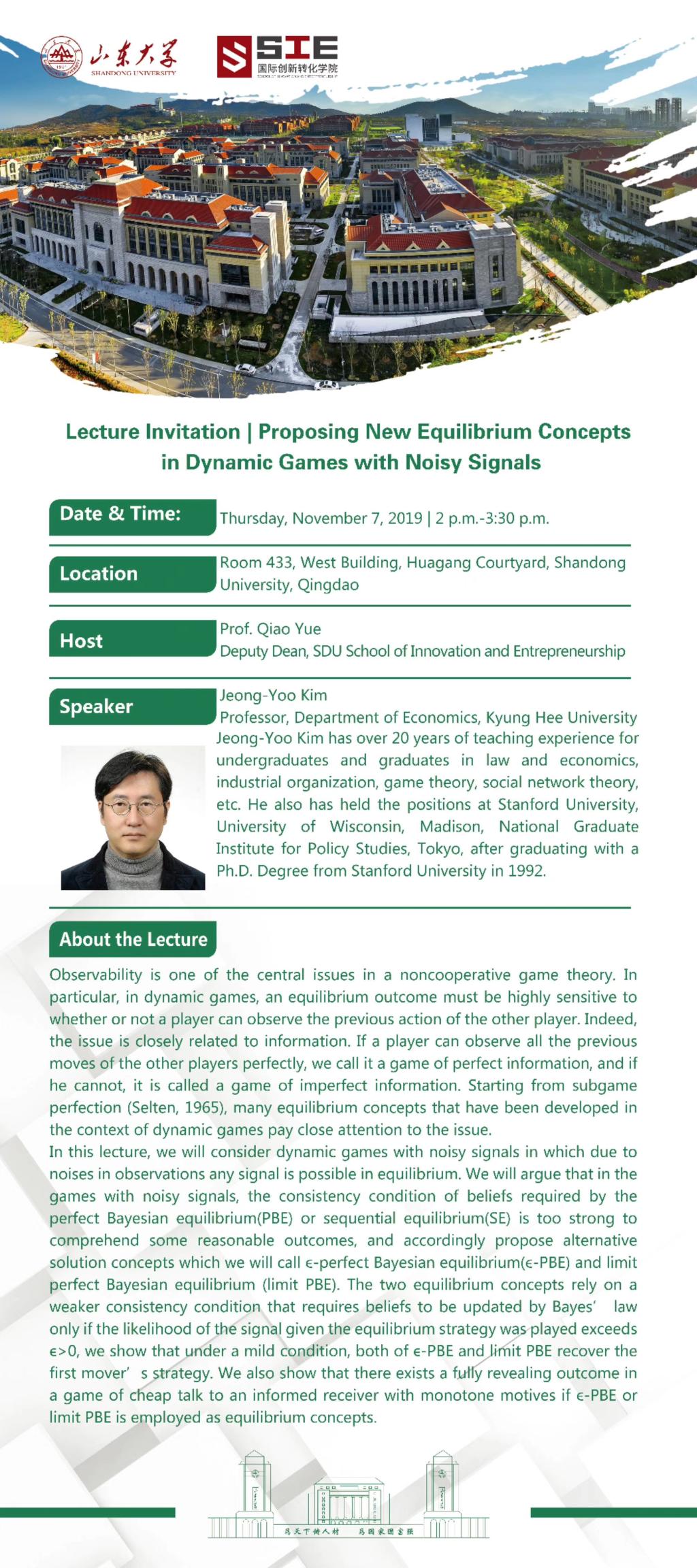 Lecture Invitation|Proposing New Equilibrium Concepts in Dynamic Games with Noisy Signals