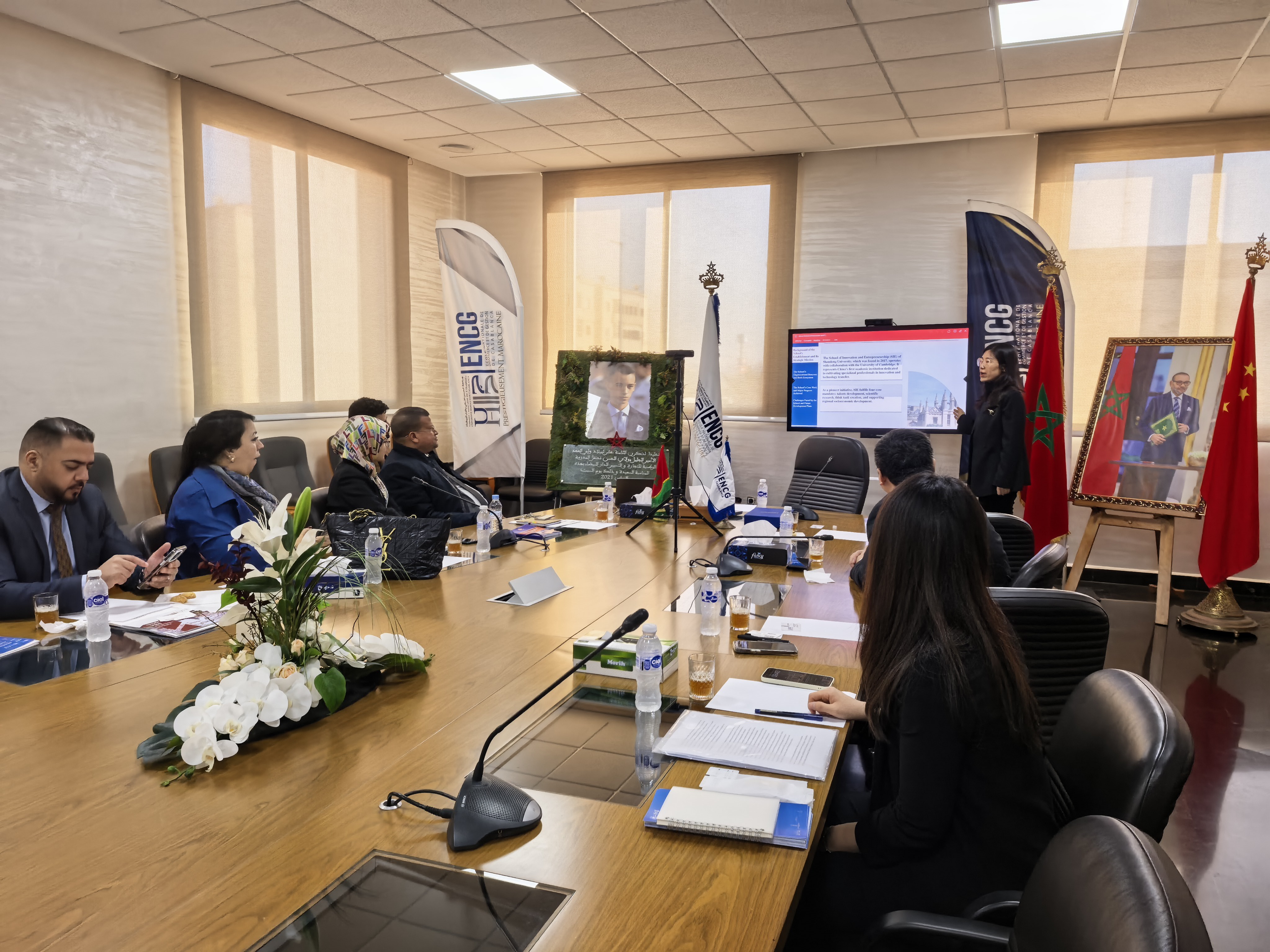 在摩洛哥期间,代表团访问了哈桑二世卡萨布兰卡大学国立商业管理学院,与该院院长Smail Kabbaj教授以及教师代表等座谈。卢翠翠副教授详细介绍了学院发展情况,胡爽老师介绍了学院国际项目招生、培养、奖学金申请、校园生活等信息。双方还就联合举办国际会议、暑期学校、师资互访等领域深入交换意见,就接下来的合作模式和线上招生宣讲等达成了积极意向。