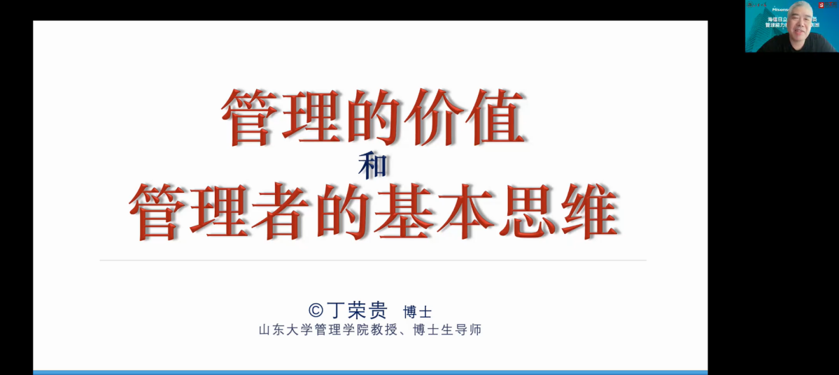 管理学院丁荣贵教授为大家带来了题为《管理的价值和管理者的基本思维》的专题讲座。首先,他认为管理的核心在于价值的创造与传递,管理要为解决主要矛盾而服务;其次,管理的关键在于用人,根据具备不同条件的员工,制定不同的用人方式;同时,还要注重管理的方法,注重流程、评价、奖罚、沟通等方面的科学性,并为大家提供了具体、可操作的工具。