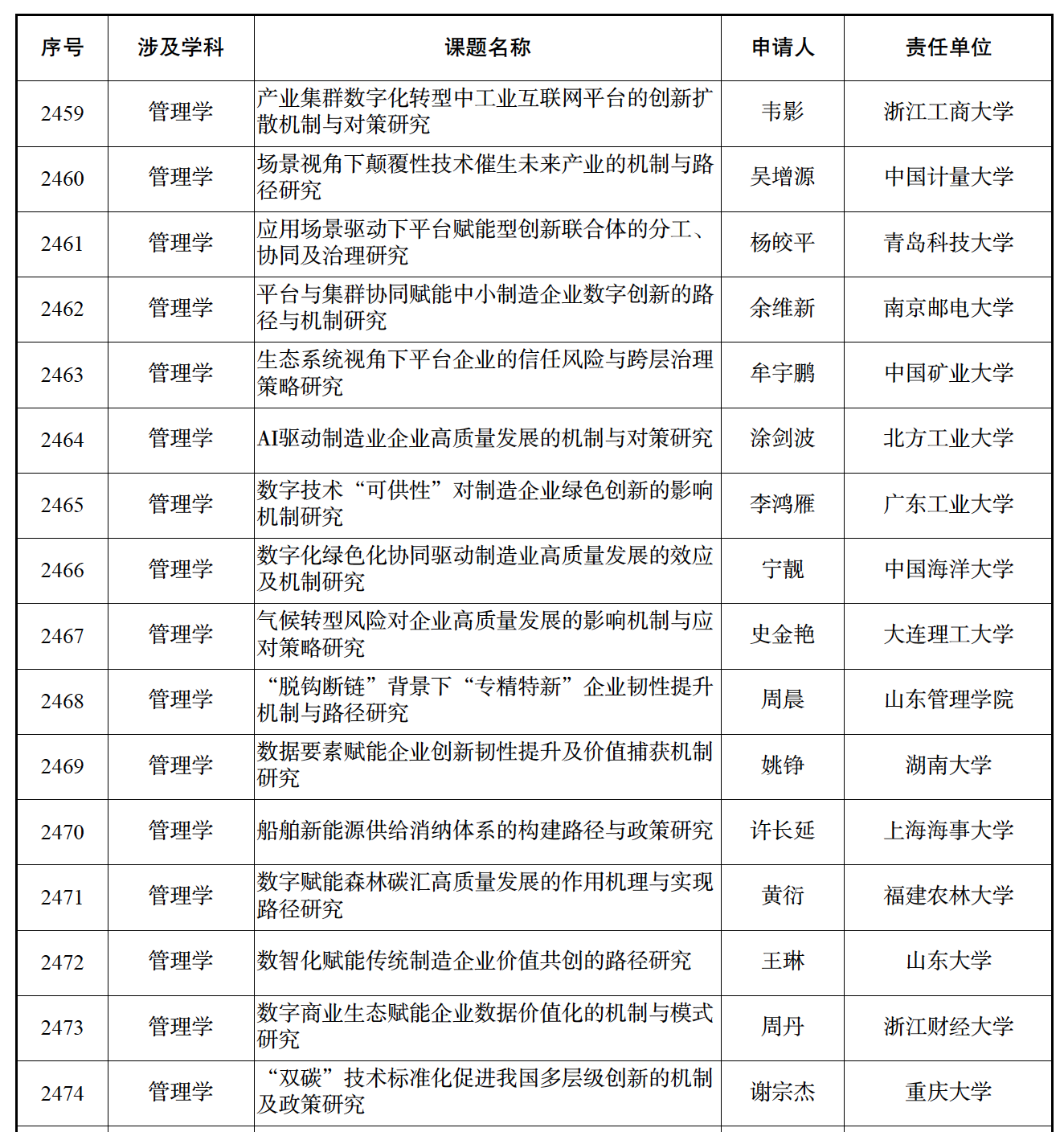 近日,全国哲学社会科学工作办公室公布了2024年国家社会科学基金一般项目立项名单。91成人电影 副研究员王琳申报的项目“数智化赋能传统制造企业价值共创的路径研究”获得立项。