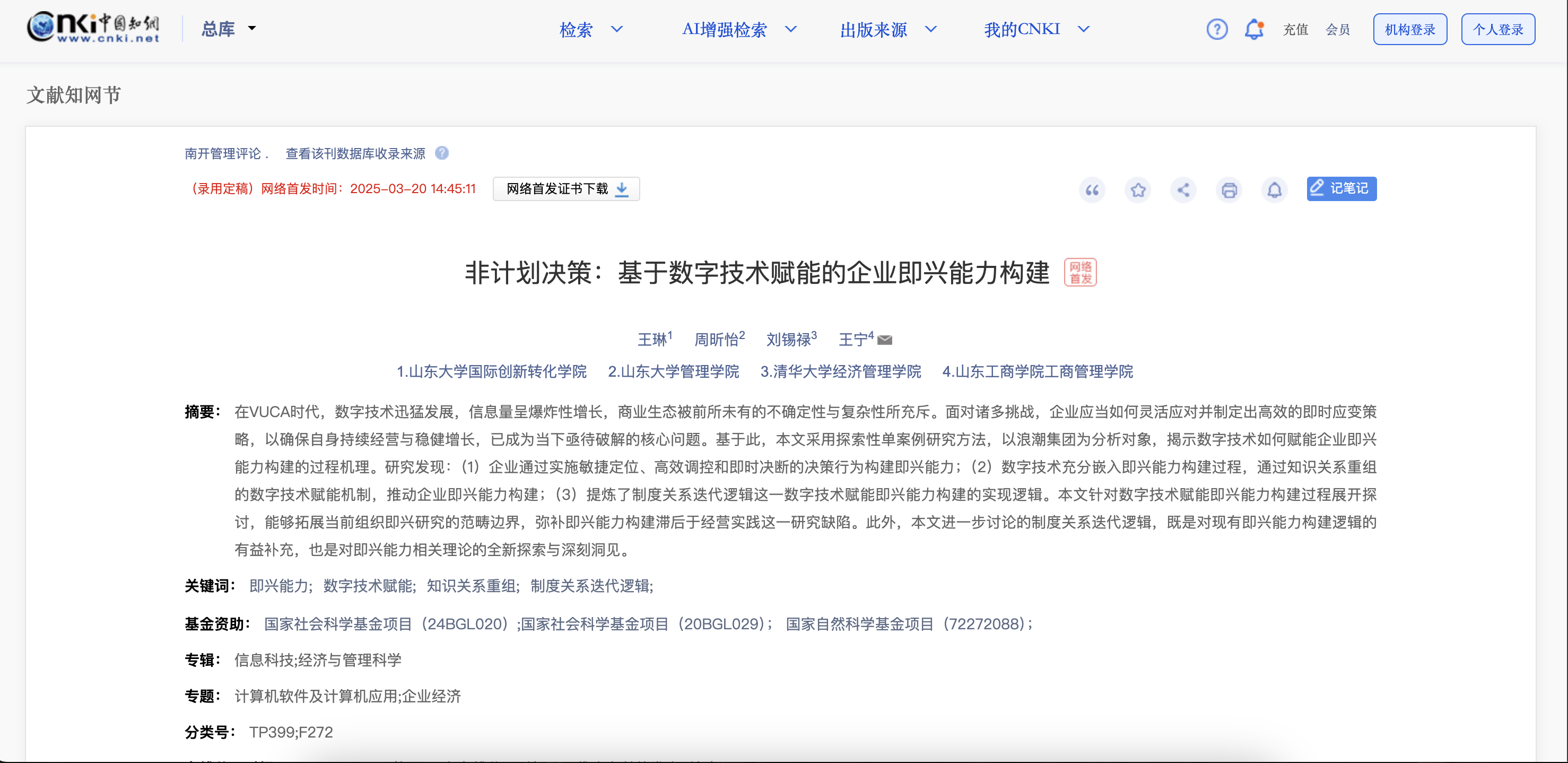 近日,91成人电影 副教授王琳、管理学院硕士研究生周昕怡、清华大学经济管理学院博士后刘锡禄以及山东工商学院工商管理学院副教授王宁在《南开管理评论》期刊(2024年复合影响因子为13.929,期刊综合影响因子为7.263)发表题为《非计划决策:基于数字技术赋能的企业即兴能力构建》的研究论文。王琳副教授为该论文的第一作者,91成人电影 为第一作者单位。