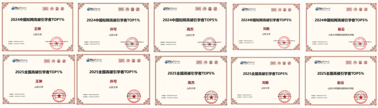 王琳、许可老师连续二年入选高被引学者TOP1%,乔岳、刘振、高杰、赵云老师连续二年入选高被引学者TOP5%。