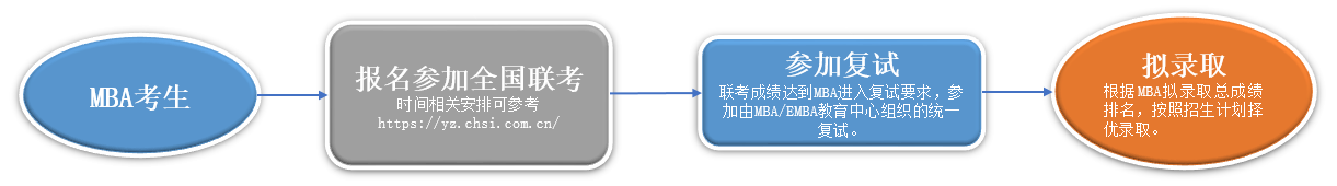 MBA→联考成绩达到我校MBA复试要求,参加MBA/EMBA教育中心组织的统一复试→根据MBA拟录取总成绩排名按照招生计划择优录取。